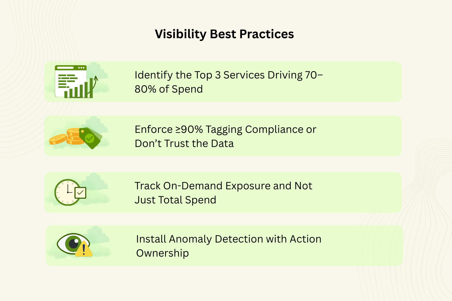 Remember that visibility best practices don’t reduce costs directly. They expose where structural overpayment lives. In most mid-market cloud environments ($1M–$10M annual spend), this layer unlocks 5–10% savings and prevents larger mistakes later.