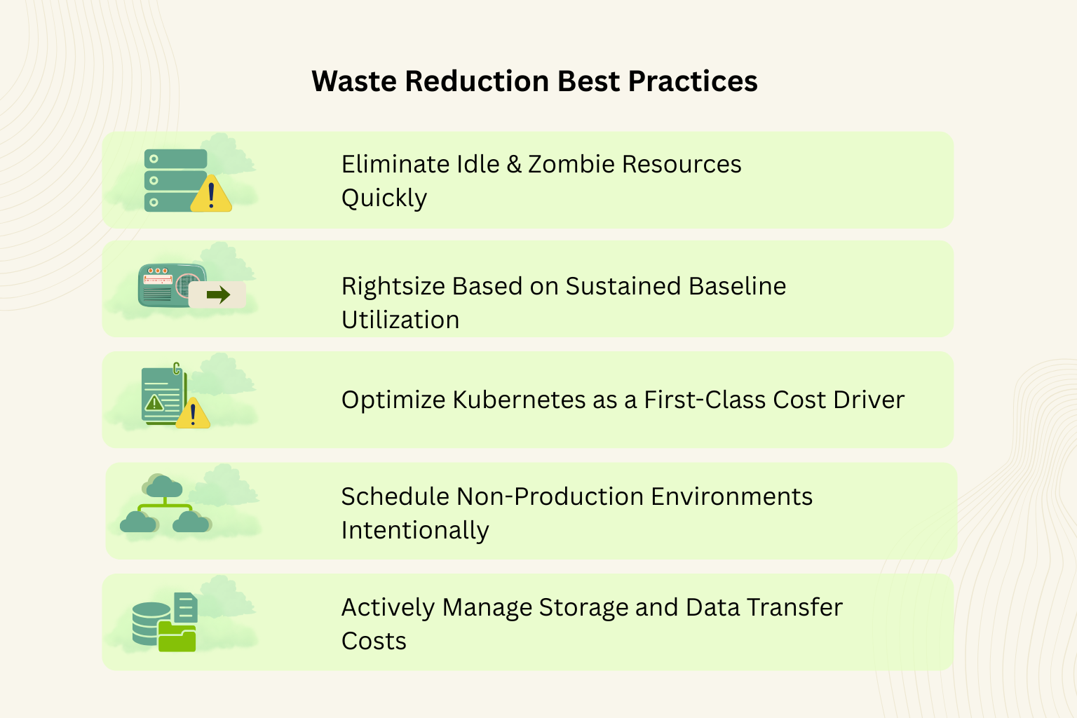 Once visibility is in place, the next layer of cloud cost optimization best practices focuses on eliminating structural waste. This is where most engineering-driven optimization happens and where many teams mistakenly believe they are “fully optimized.”
