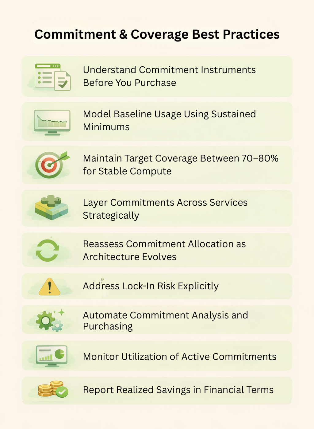 This section focuses on commitment and coverage best practices which is the discipline of aligning baseline usage with discounted commitment instruments across AWS, Azure, and GCP. When executed correctly, this layer typically produces the largest savings impact.